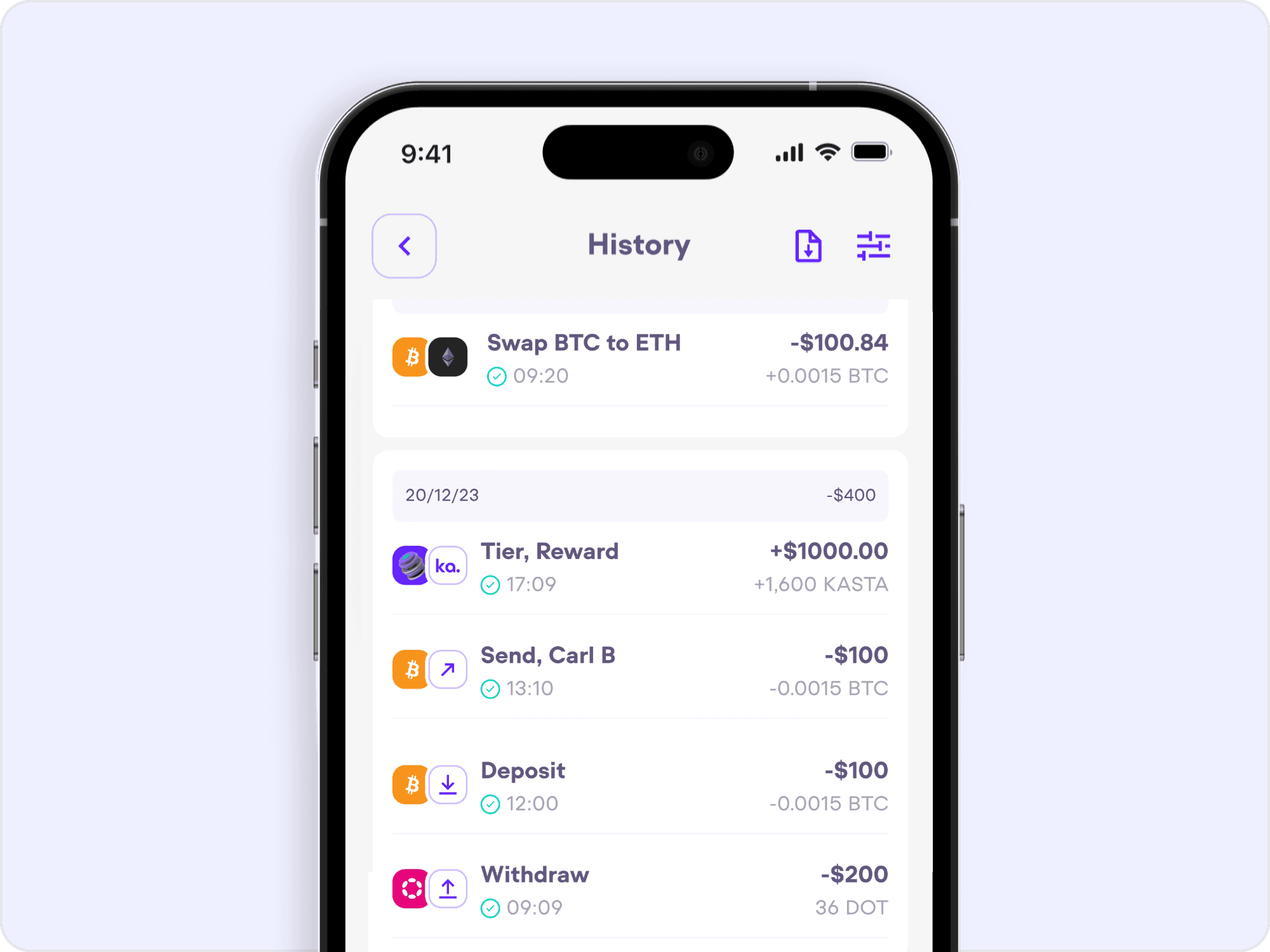 Refined the transaction history flow, incorporating intuitive icons, simplified labels, and real-time update indicators.
